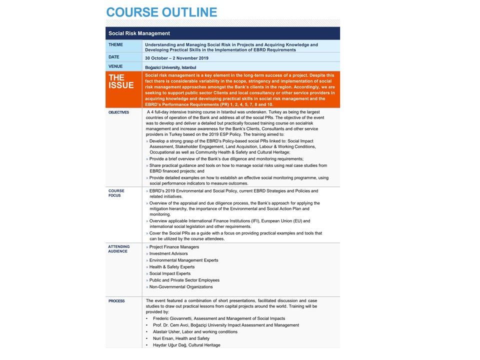 Prof. Cem Avcı was part of the training team who undertook 4 day training session conducted for the European Bank for Reconstruction and Development (EBRD) in October 30th -November 2nd 2019. The training was aimed at improving the understanding and managing social risk in Projects and acquiring knowledge and developing practical skills in the implementation of EBRD Requirements. The attendees included Public and Private Sector Employees, Social Impact Experts, Health & Safety Experts, Environmental Management Experts, Investment Advisors.