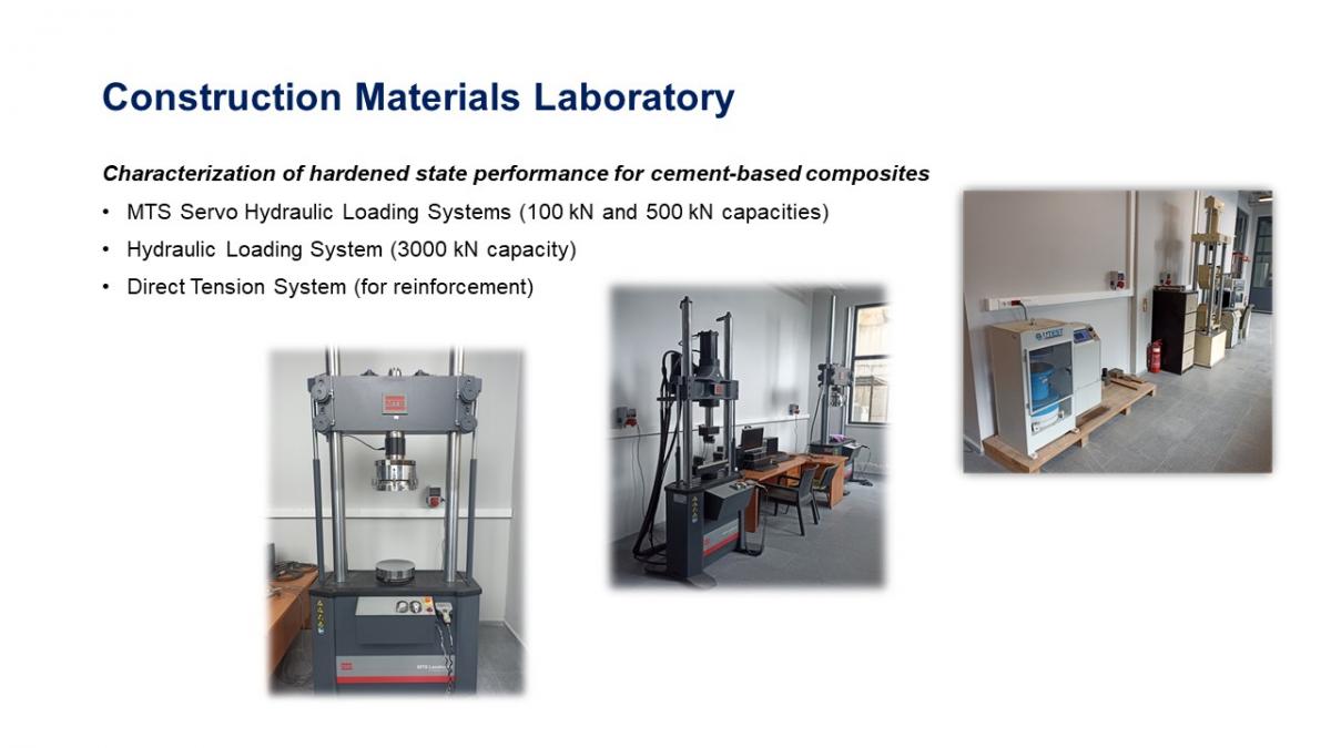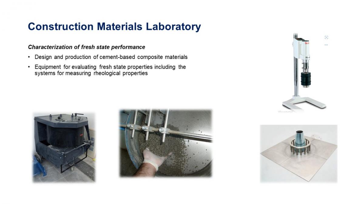 The Construction Matareials laboratory is equipped with various pieces of equipment and test systems required to design- produce and characterize different building materials at different levels from fresh to hardened state performance with a focus on increased durability and sustainability.